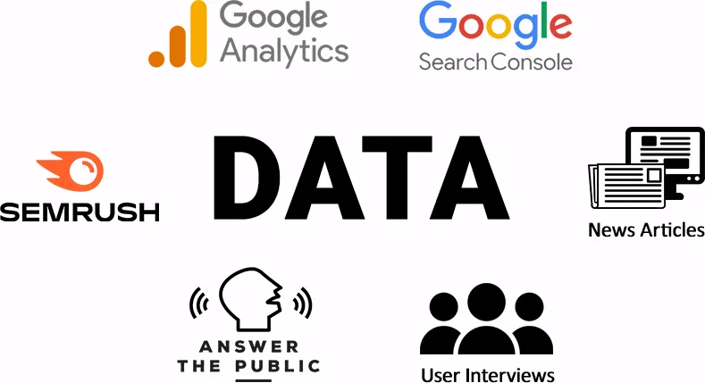 To achieve this, I relied on six primary sources of data for my analysis: Google Analytics, Search Console, SEMRush, AnswerThePublic, news articles, and user interviews. My primary focus was on identifying common user pathways, pain points, and attrition areas.